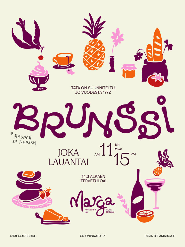 Marga tarjoilee brunssia lauantaisin klo 11–15. Tule silloin kun sinulle sopii – osa saapuu aikaisin pitkälle aamiaiselle, toiset hetkeä myöhemmin slow lunch -hengessä.